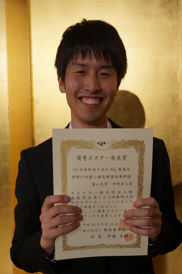 2018年5月26~27日に、熊本大学で第134回春季軽金属学会が開催され、材料機能工学専攻 修士2年 中村直人君が「Gd合金粉末を含むMg基複合材料の作製と磁気熱量効果評価」という研究発表を行い、優秀ポスター発表賞を受賞しました。