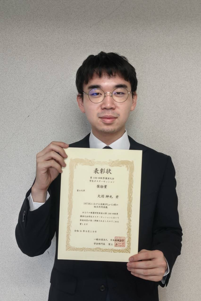 2024年9月19日大阪大学豊中キャンパスにおいて開催された「日本鉄鋼協会第188回秋季講演大会 学生ポスターセッション」において、材料デザイン工学科鉄鋼材料工学講座(小野英樹教授)の、大学院理工学研究科修士課程1年の大羽紳也さんによる研究発表が奨励賞を受賞しました。