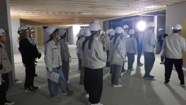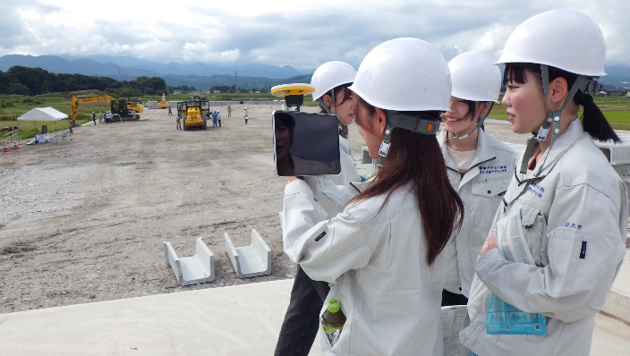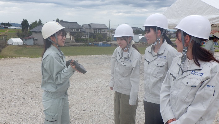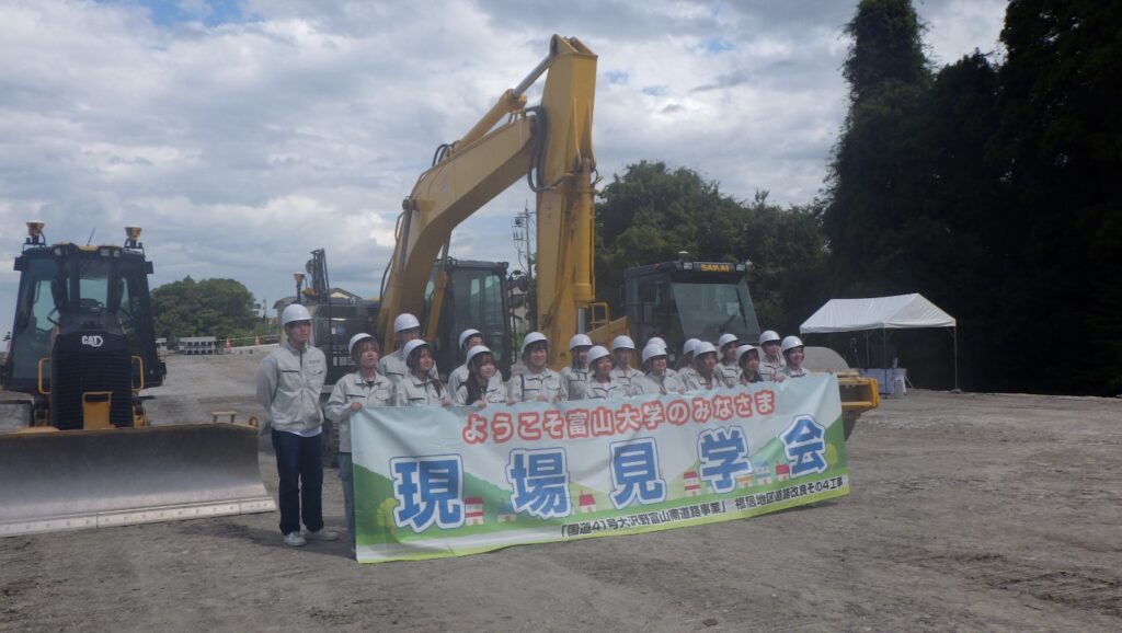 都市・交通デザイン学科の1年生19名が富山県主催の「大学生と若手技術者等による現場見学会」に参加しました。午前中は「国道41号大沢野富山南道路事業の福居地区道路改良工事」を見学し、午後は「富山市立義務教育学校水橋学園新築工事」を視察しました。道路改良の現場ではICT施工が推進されており、GNSSを搭載した重機の操作やドローンによる測量、AR技術といった最新技術を活用した施工が行われていました。現場で説明を受けるだけでなく実際に体験する機会をいただき、学内では得られない貴重な経験となりました。どちらの現場でも多くの技術者の方々から生の声を伺い、学生の質問にも丁寧にご回答いただきました。現場の専門的なことだけでなく建設現場で働く環境や仕事のやりがいについても知ることができました。