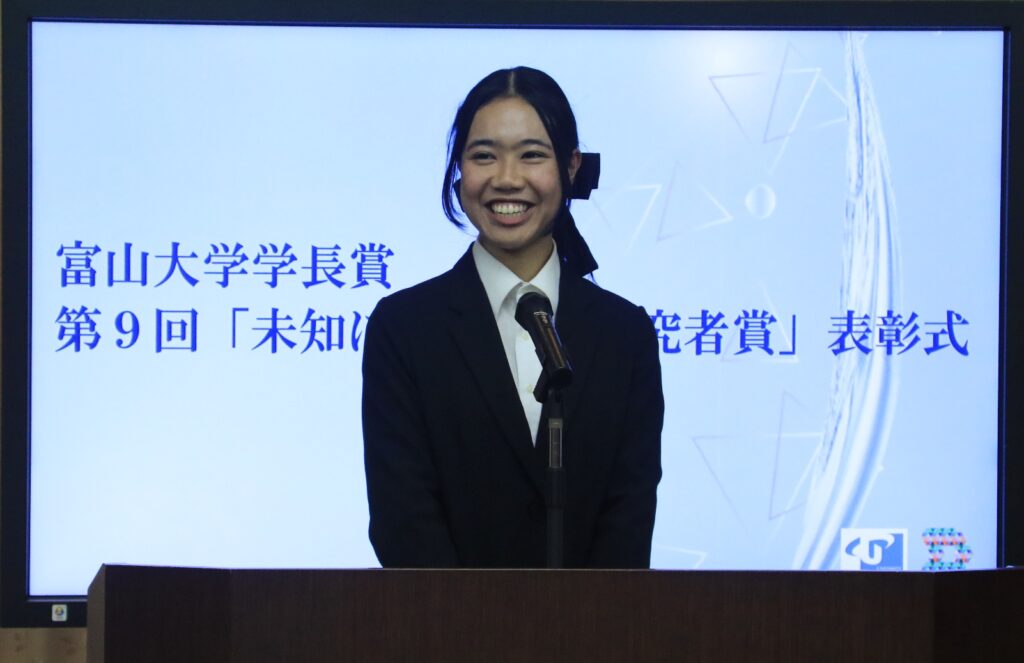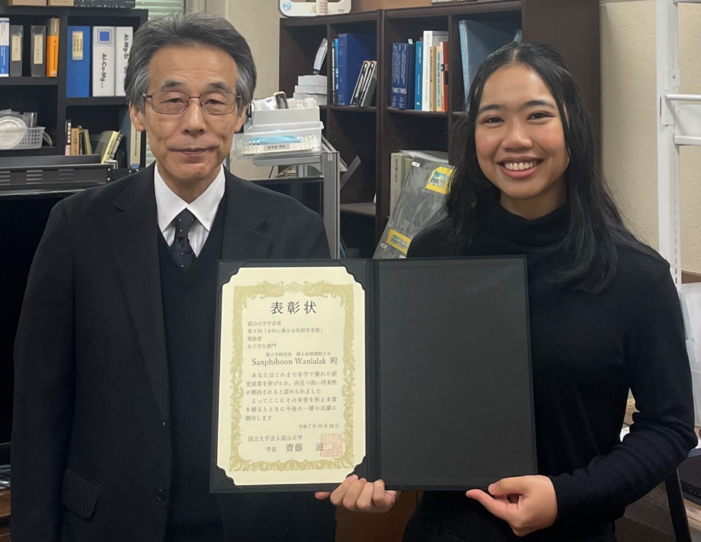 修士2年のSanphiboonWanlalakさんが富山大学学長賞第9回「未知に挑む女性研究者賞」奨励賞を受賞し、2025年10月28日に表彰式が開催されました。